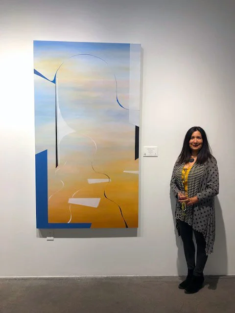 In some of her work, Carolina’s architectural background becomes evident through the use of solid shapes, lines, and geometric forms combined with acrylic marks and pencils. She integrates realistic urban scenes with fictional elements, resulting in her signature abstract cityscape style.